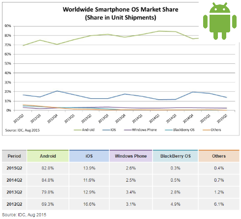 According to IDC reasearch, the Android operating system is used by 82% of the world’s mobile devices and continues to climb in use year over year. Apple’s iOS operating system holds a 13.9% of the world’s mobile devices coming in second place.